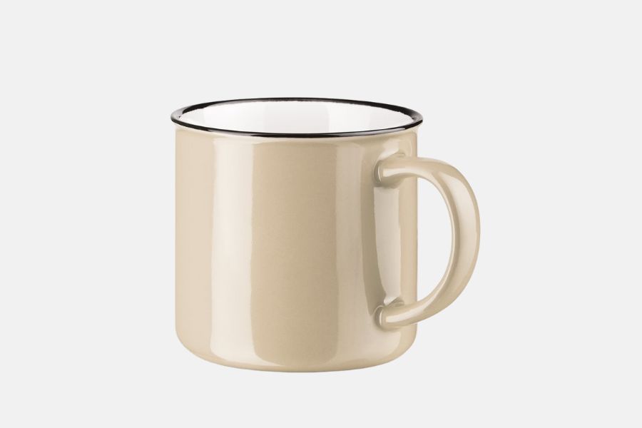 This stunning vintage-style mug, crafted from high-quality ceramic with a sleek black rim, is made in Europe and personalized in Portugal, ensuring exceptional craftsmanship and adherence to European standards. With its classic retro design, this custom vintage ceramic mug is a perfect fit for any setting, whether it’s an elegant breakfast spread, a casual coffee break, or a relaxing moment with your favorite drink. Its polished finish and ideal size make it both practical and stylish, while the black rim adds a touch of vintage charm. Available in greige, taupe, yellow, navy, red, and green, it lends a timeless charm to any table. Fully customizable with your logo or chosen design, this mug is an excellent way to showcase your establishment’s unique identity or commemorate a special event. Delivered in a sleek white cardboard box, it makes an ideal welcome gift for hotel guests, a thoughtful corporate gift for Christmas, or a memorable keepsake for any special occasion. Surprise your clients or guests with a durable and stylish piece they’ll love to use! Don’t miss our straight-sided ceramic mug for even more options.